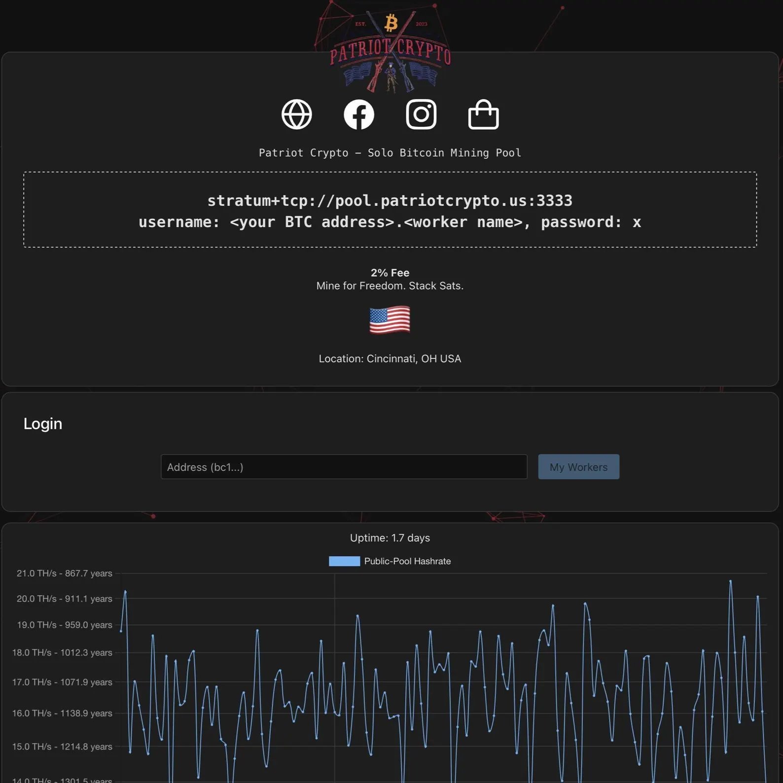 Monitor your miner anytime at pool.patriotcrypto.us — just enter your Bitcoin wallet address.